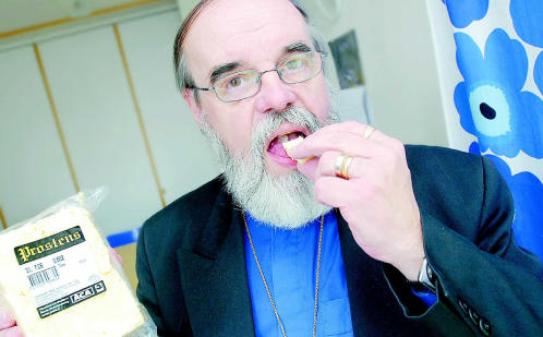”Våran prost”. Det får nog räcka med rondören, säger prosten Erik Håkans, och tänker på Gustaf Frödings dikt: ”Våran prost är rund som en ost…” Därför blir det nog inte den nya osten ”Prostens” på varje smörgås framöver. Men smak har ÅCA:s nykomling. Foto: JONAS EDSVIK