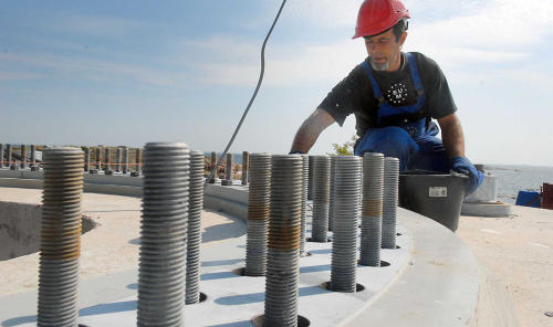 Mutter, mutter. Skönt men blåsigt, tycker Rogério Contreiras om sitt jobb på Båtskären och kontrollräknar de jättelika muttrar som behövs vid monteringen av de första delarna som läggs på fundamentet.
