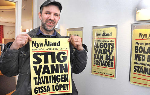 Glad vinnare. – Gratulerar och här är resepresentkortet på 1.000 euro, sa Nya Ålands vd Stefan Norrgrann till den överraskade Gissa löpet-segraren Stig Mattsson. Spanien nästa? Foto: STEFAN ÖHBERG