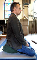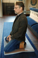 Sättet att sitta när man mediterar är fysiologiskt motiverat. Genom tusentals år av erfarenhet har man hittat några sittställningar som bidrar till avspänning och vila. Oberoende av om man sitter med benen i kors i lotus eller halvlotusställning, om man sitter på knä eller på en stol är grundprincipen den samma. Överkroppen hålls rak och upprätt, man orkar sitta länge om man har en stadig grund. Grunden består av en trekant vars ena bas är sittknölarna och de två andra knäna. Så sitter ett litet barn alldeles av sig själv, utan att ha gått på kurs. Inom kyrkan är sittandet på knä med en bönepall eller en bönekudde under rumpan det vanligaste. För människor som har problem med knäna eller av olika anledningar är styva och stela är sittandet på stol det enklaste. Händerna brukar man placera i famnen, den ena handen vilar i den andra och tummarna möts. – Grejen med tummarna är helt enkelt det att man genast märker när man börjar dagdrömma eller tappa koncentrationen för då brukar tummarna glida ifrån varandra, berättar Kent Danielsson. Blicken fäster man på golvet en bit framför sig. Man rekommenderar att ögonen hålls halvöppna istället för slutna. Blundar man är det lättare att hänge sig åt drömmerier eller falla i sömn. Sitter man så här kan man sitta länge och vara både djupt avslappnad och väldigt alert samtidigt. (kg)